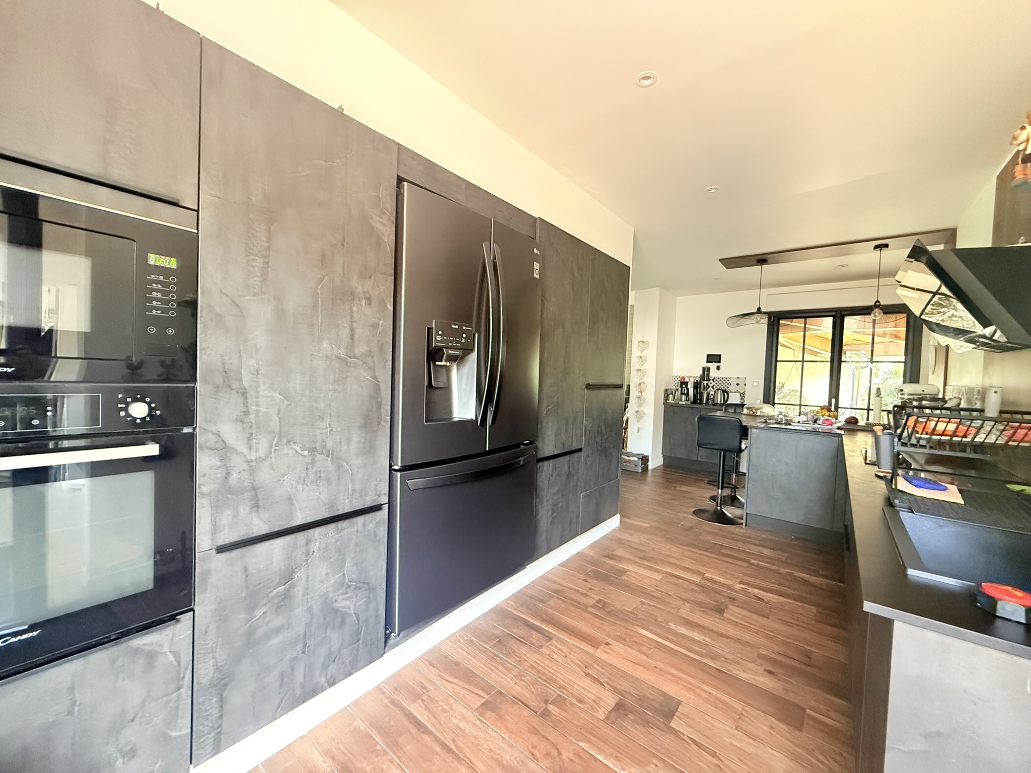 Elle est composée d’une cuisine aménagée et équipée ouverte sur une pièce de vie centrale baignée de lumière et faisant office de cœur de la villa.