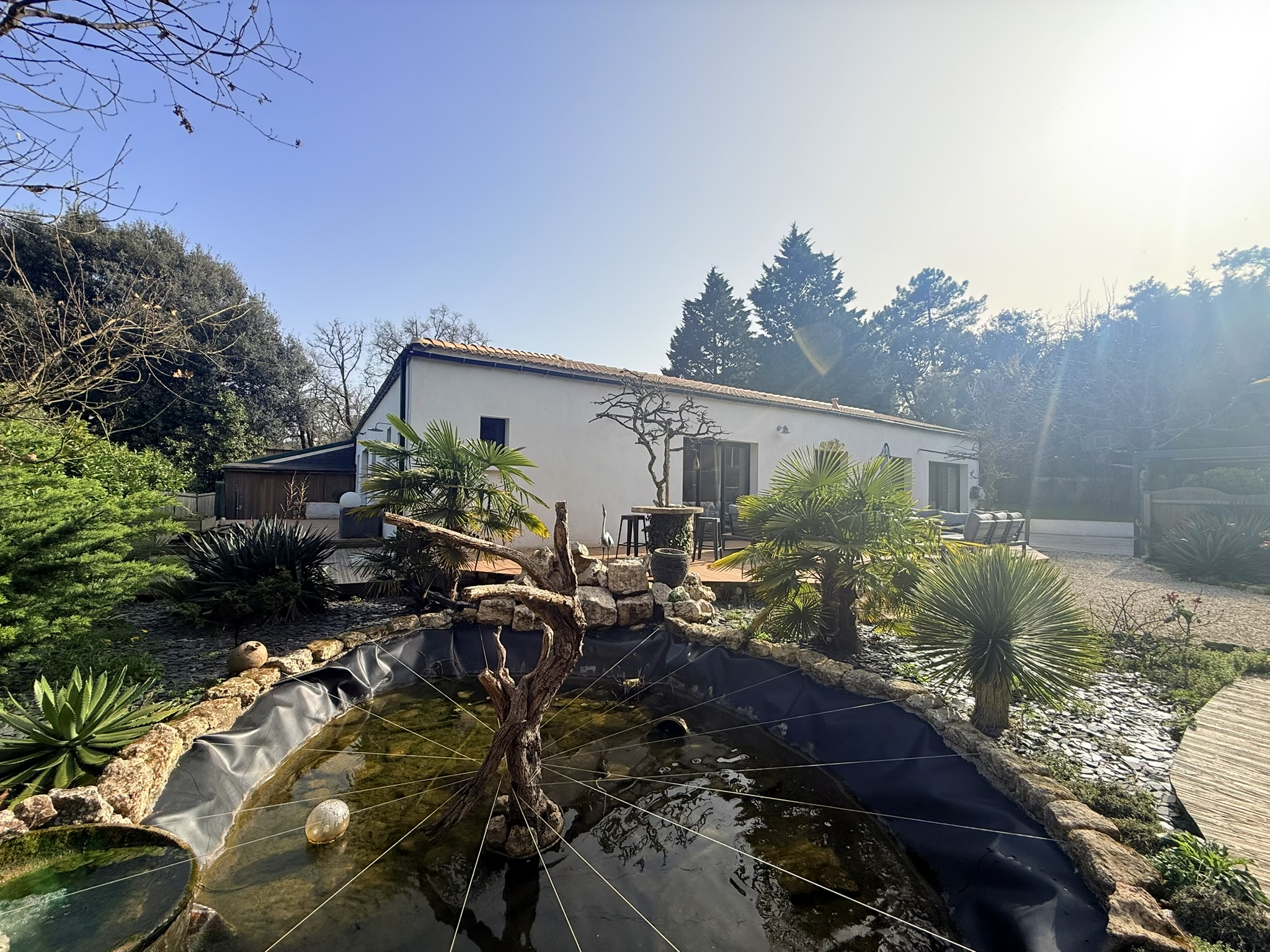 Le jardin, arboré, possède également un bassin d’agrément et plusieurs places de stationnement.